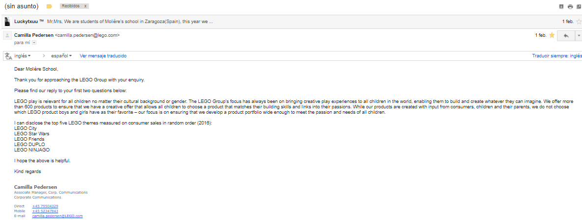 De plus, pour compléter nos investigations à propos de l'entreprise et ses ventes (adaptation en différentes gammes) nous avons envoyé différents emails à plusieurs pays dont l' un d'eux nous a répondu. Celui- ci est le Danemark où se trouve le siège principal de l' entreprise Lego.